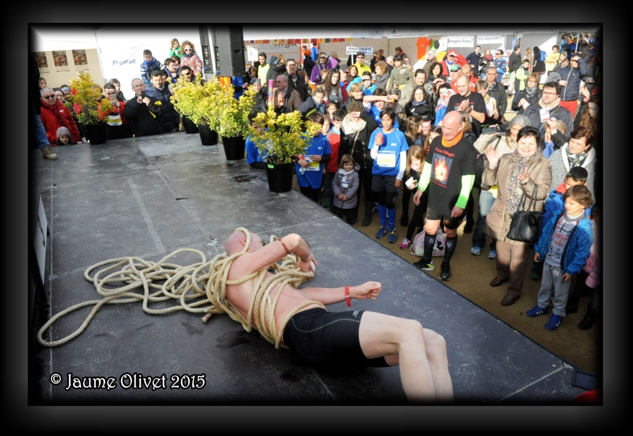 Després de correr els 5 kilòmetres de la Santi Centelles, el Fakir Vaxi Magic fa el seu espectacle a l'escenari. Jo volia fer el recorregut amb ell, però m'he aixecat amb molt de mal al dit gros de la meva mà esquerra. |