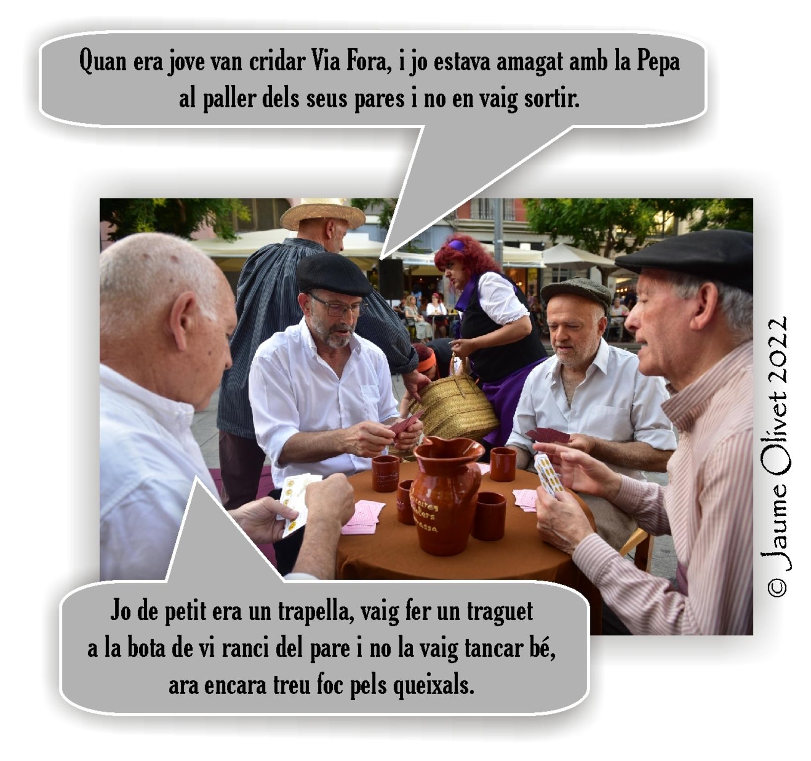 I com sempre el lloc més concorregut a primera hora és la taberna, on en Jaumet "cara de moc" i el seu company "en secall" ja fa hores que hi treballen. Uns hi tracten pactes tot bevent, altres maten el temps tot jugant a cartes i alguns ves a saber que hi fan. |