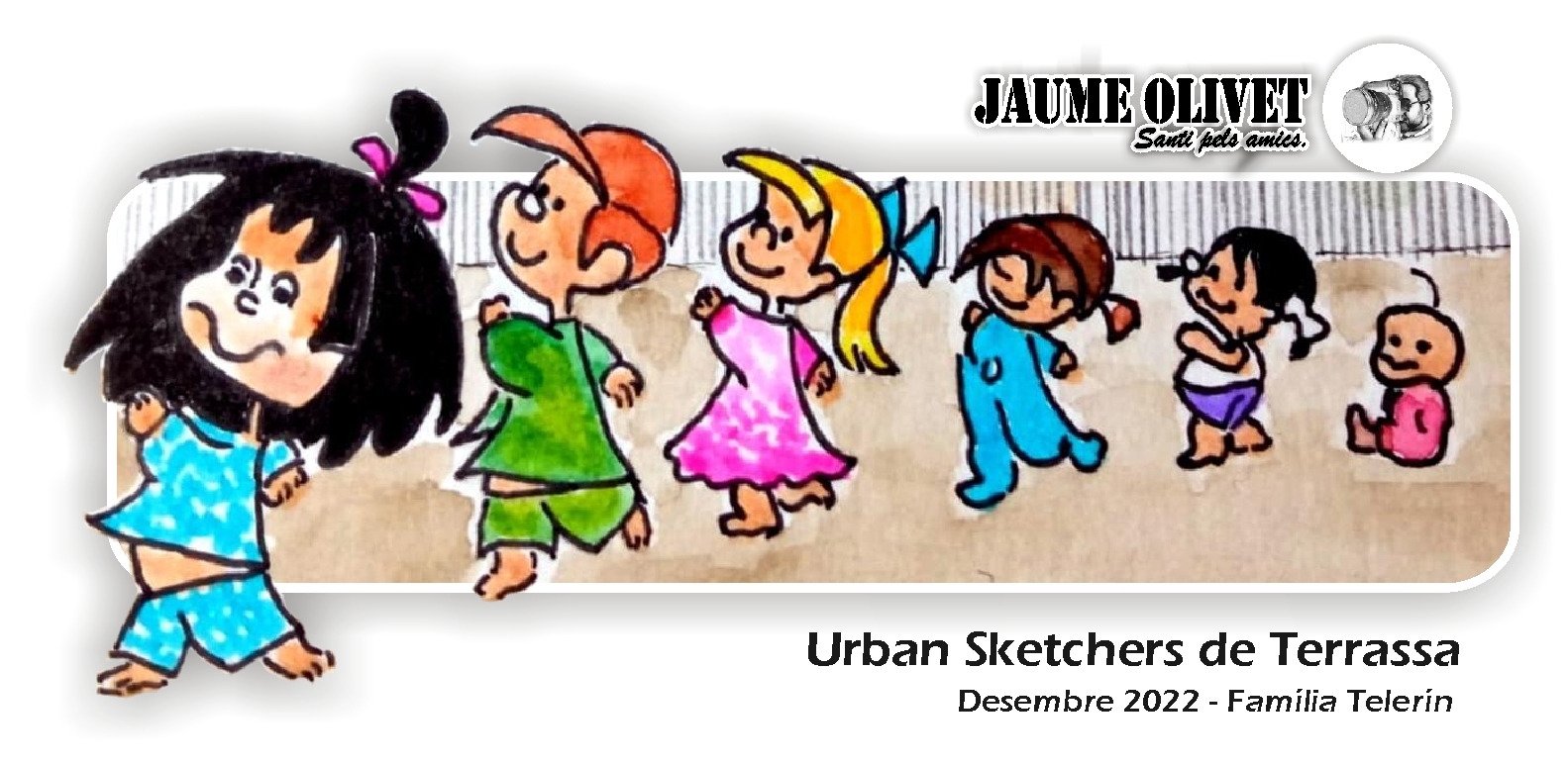 Manifest dels Urban Sketchers "Dibuixem "in situ", a cobert o a l'aire lliure, capturant directament el que observem. els nostres dibuixos expliquen la historia del nostre entorn, dels llocs on vivim i on viatgem. A l'hora de dibuixar documentem un lloc i un moment determinat. Som fidels a les escenes que presenciem. Celebrem la diversitat d'estils de dibuix i fem servir qualsevol tipus d'eina i suport. Ens ajudem mútuament i dibuixem en grup. Compartim els nostres dibuixos a internet. Mostrem el món dibuix a dibuix". Amb aquesta proposta "Personatges a Terrassa" es surten una mica dels seus principis, però és per una bona causa. - Explicació - "Els personatges visiten Terrassa" - Podeu: Tornar a l'inici. |